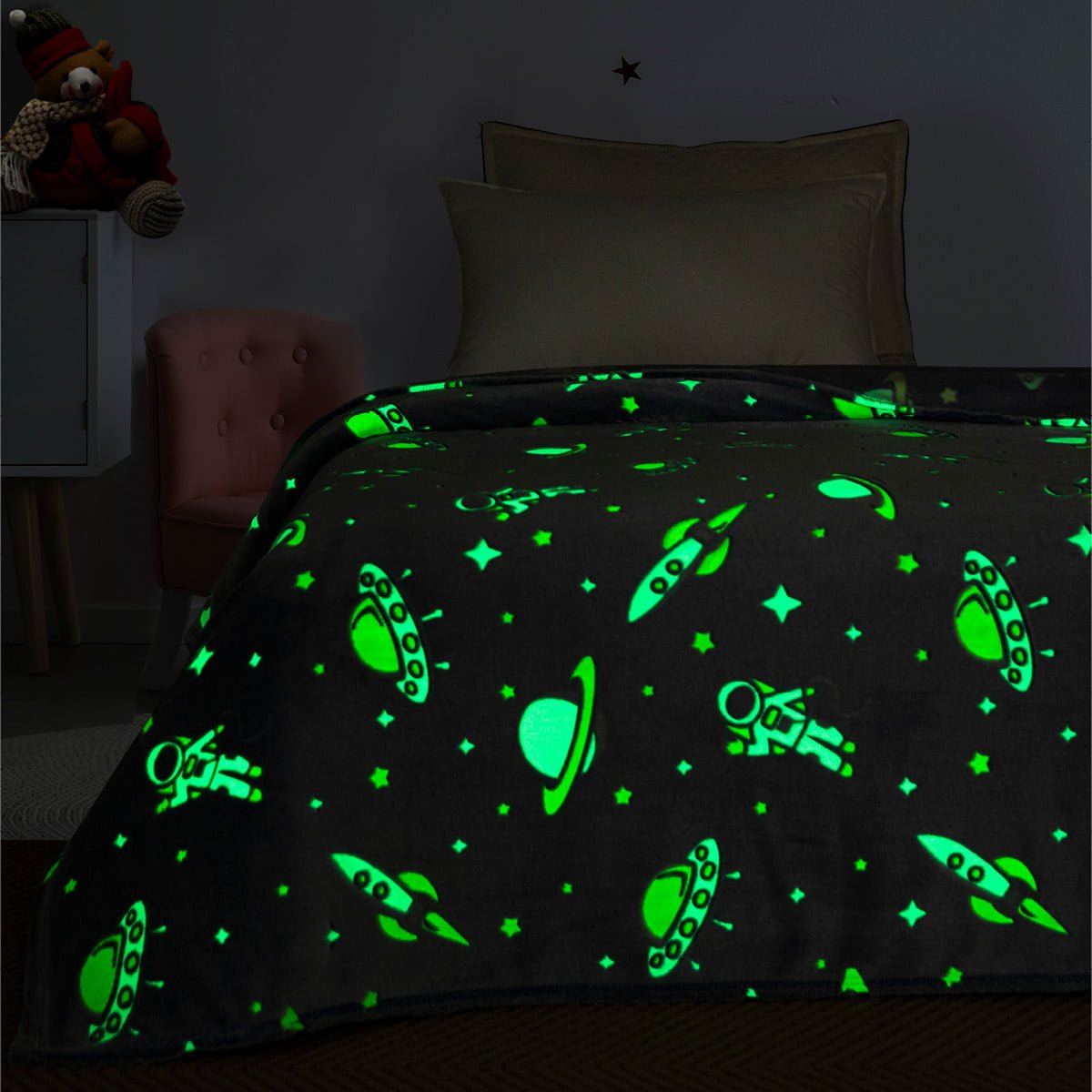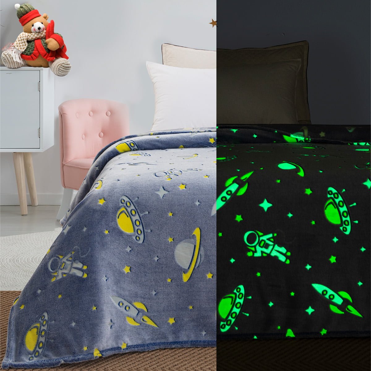 Η νέα μας κουβέρτα Flash-Fleece κατασκευάζεται από μαλακό φλις και φωσφορίζει στο σκοτάδι για να σας παρέχει ζεστασιά και παιδικά γέλια κάθε βράδυ!