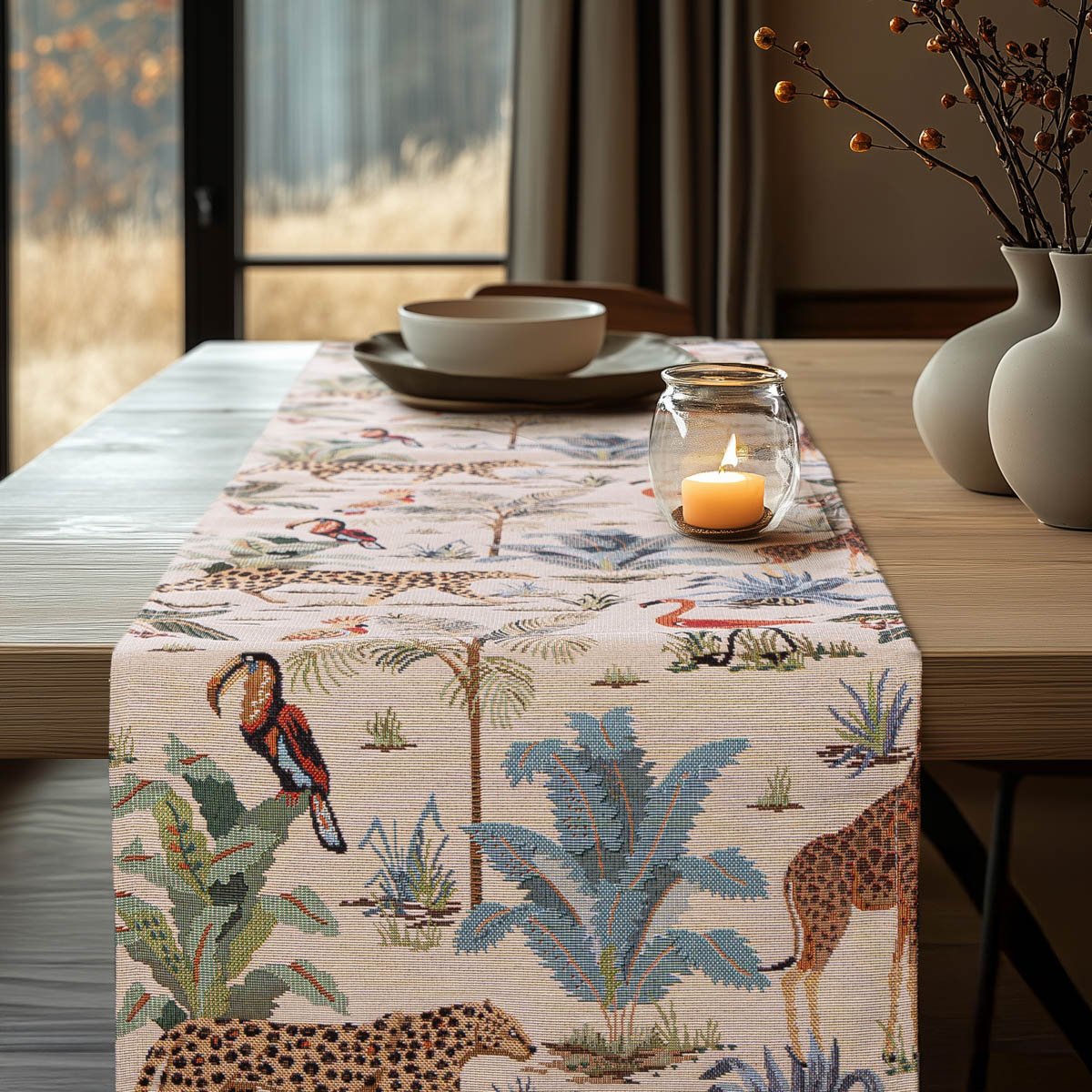 Ράννερ Στόφα Ζώα της Ζούγκλας, κατασκευασμένο από υψηλής ποιότητας στόφα με σχέδιο εμπνευσμένο από τα ζώα της ζούγκλας. Το σχέδιο προσφέρει μία διασκεδαστική και ζωντανή αίσθηση στον χώρο, ιδανικό για τραπέζια ή κονσόλες. Ιδανικό για πάρτι, παιδικά δωμάτια ή θεματικές εκδηλώσεις, το ράννερ αυτό προσδίδει μία παιχνιδιάρικη και τροπική ατμόσφαιρα.