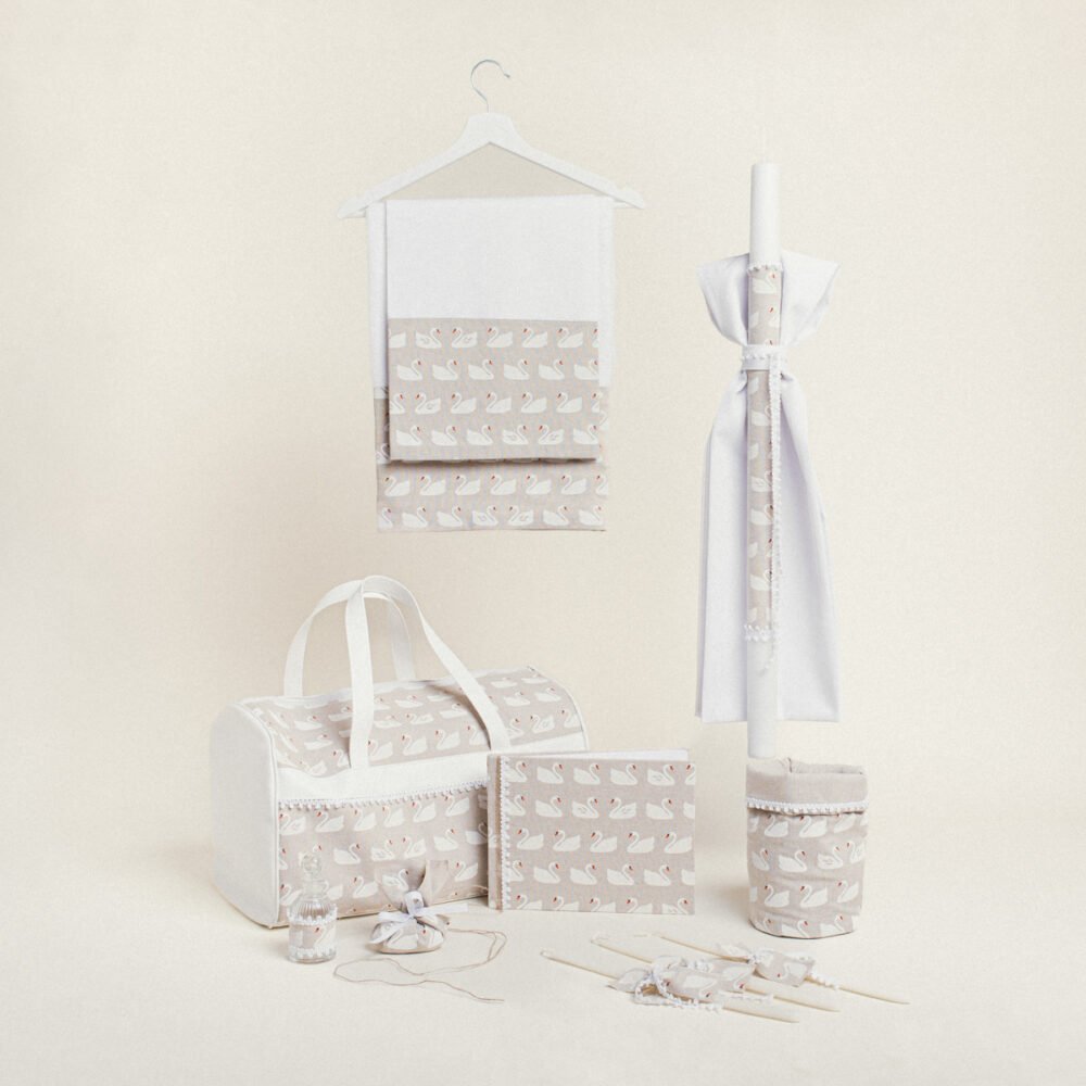 Ένα κομψό και ρομαντικό σετ βάπτισης με θέμα τους κύκνους, ιδανικό για μια elegant και μαγευτική βάπτιση.