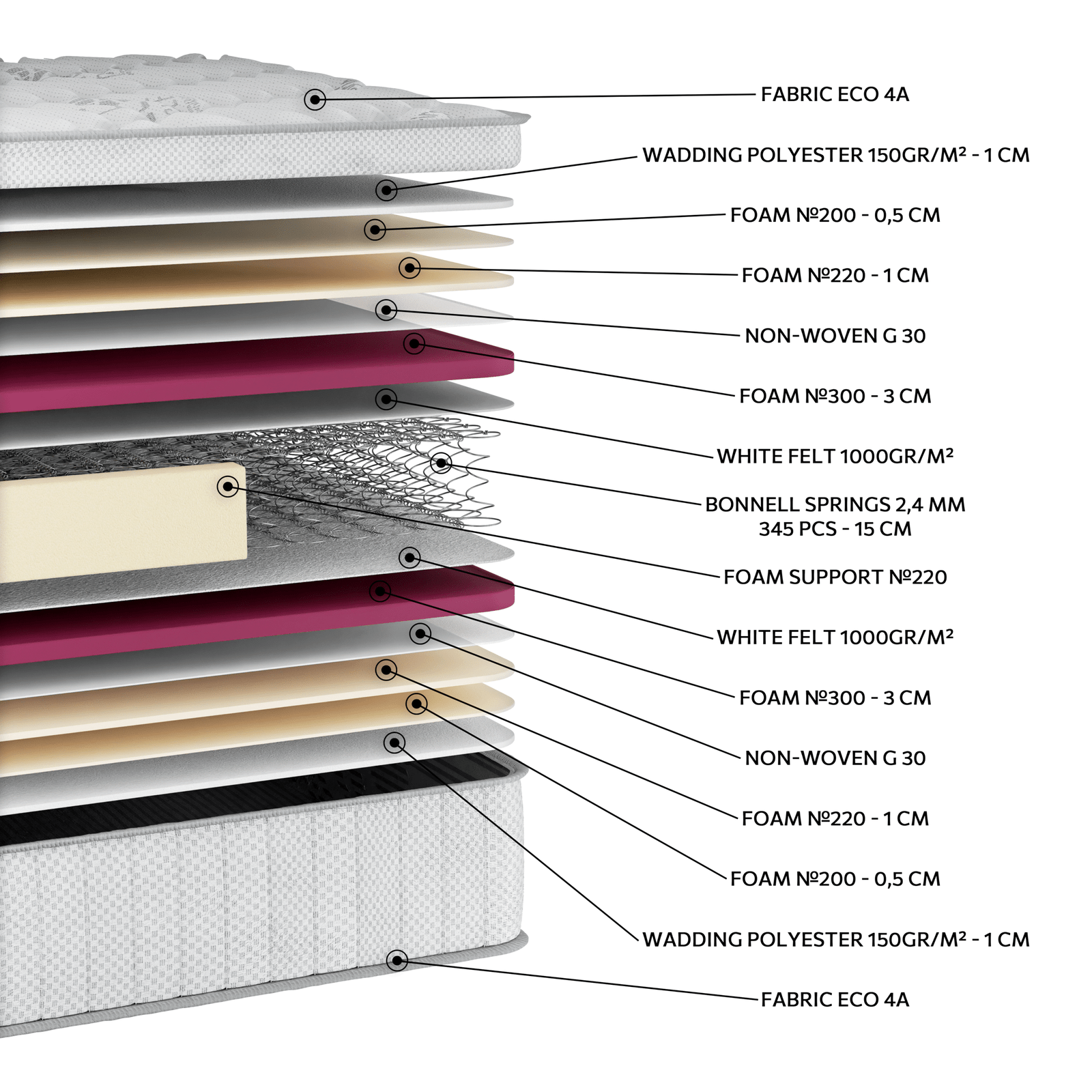 Στρώμα μέτριας προς σκληρής σκληρότητας με ελατήρια Bonnell, που προσφέρουν σταθερή υποστήριξη και υψηλή αντοχή στον χρόνο. Οι στρώσεις αφρού συμβάλλουν στην ομοιόμορφη κατανομή του βάρους και την άνεση, ενώ το ύφασμα Eco 4A εξασφαλίζει καλή κυκλοφορία του αέρα και υγιεινές συνθήκες ύπνου.