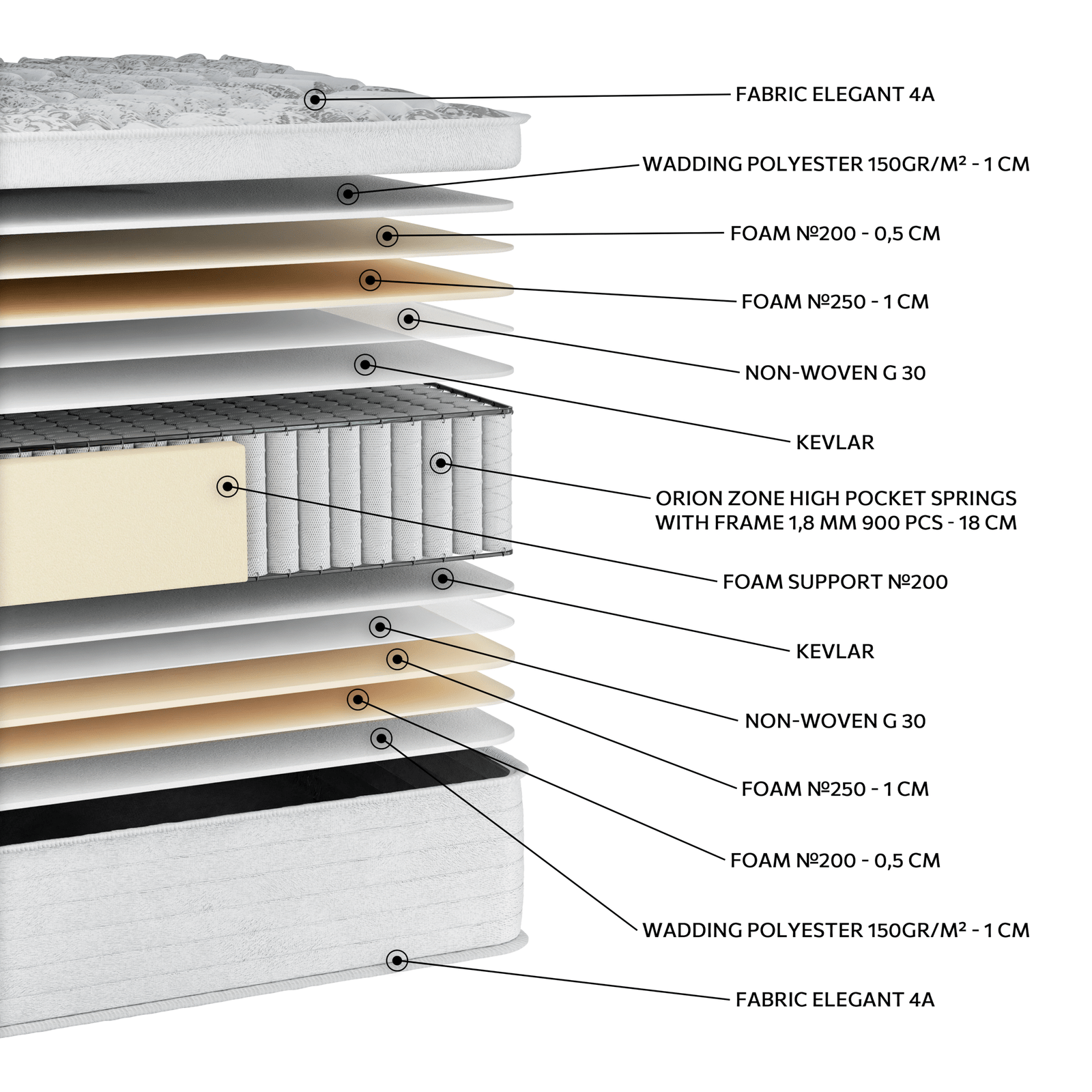 Στρώμα μέτριας σκληρότητας με Orion Zone Pocket ελατήρια, σχεδιασμένα για αυξημένη αντοχή και ενισχυμένη στήριξη του σώματος. Η προσθήκη Kevlar ενισχύει τη σταθερότητα και την ανθεκτικότητα του στρώματος, προσφέροντας μακροχρόνια απόδοση και εξαιρετική αντοχή στη φθορά. Το ύφασμα Elegant 4A χαρίζει απαλή αίσθηση και διαχρονική ποιότητα, δημιουργώντας ένα πολυτελές περιβάλλον ύπνου. Μια εξαιρετική επιλογή για όσους αναζητούν ισορροπημένη στήριξη, αντοχή και αίσθηση πολυτέλειας.