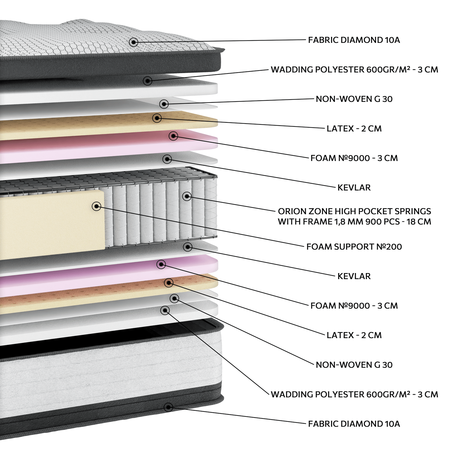 Στρώμα μέτριας σκληρότητας με Orion Zone High Pocket ελατήρια, που προσφέρουν στοχευμένη στήριξη και άνεση. Ο συνδυασμός Latex και αφρού υψηλής πυκνότητας εξασφαλίζει ελαστικότητα και ιδανική προσαρμογή στις καμπύλες του σώματος. Το ύφασμα Diamond 10A προσθέτει κομψότητα και αυξημένη αντοχή. Μια εξαιρετική επιλογή για όσους επιθυμούν ισορροπία μεταξύ στήριξης και απαλής αίσθησης.