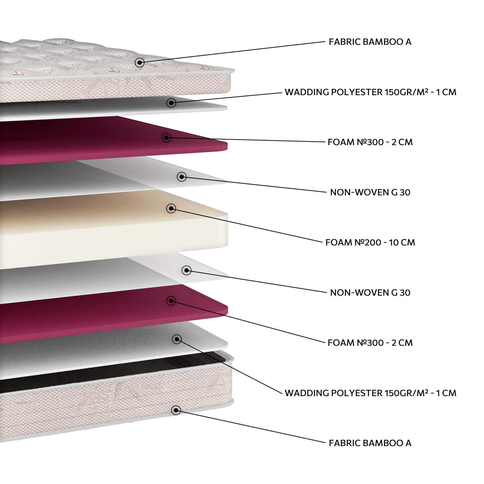 Οικονομικό στρώμα αφρού με μέτρια σκληρότητα, ιδανικό για φιλοξενούμενους, εξοχικές κατοικίες ή περιστασιακή χρήση. Οι στρώσεις αφρού προσφέρουν σταθερότητα και βασική ανατομική υποστήριξη, ενώ το ύφασμα Bamboo A επιτρέπει σωστό αερισμό και προσφέρει φυσική αίσθηση.