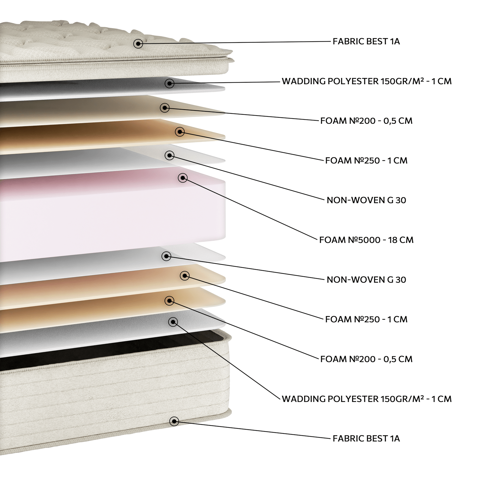Πολύ σκληρό στρώμα αφρού, ιδανικό για υπέρβαρους χρήστες που χρειάζονται αυξημένη στήριξη και σταθερότητα κατά τη διάρκεια του ύπνου. Οι στιβαρές στρώσεις αφρού προσφέρουν ανθεκτικότητα και απόλυτη ευθυγράμμιση του σώματος. Το ύφασμα Best 1A είναι απαλό και αναπνεύσιμο, ενώ η αφαιρούμενη θήκη με φερμουάρ προσφέρει πρακτικότητα και ευκολία στον καθαρισμό.